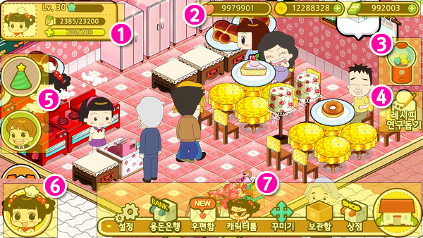 - 선물함/상점/보관함/꾸미기/캐릭터룸/설정 버튼 목록을 여는 매장 관리 버튼입니다.