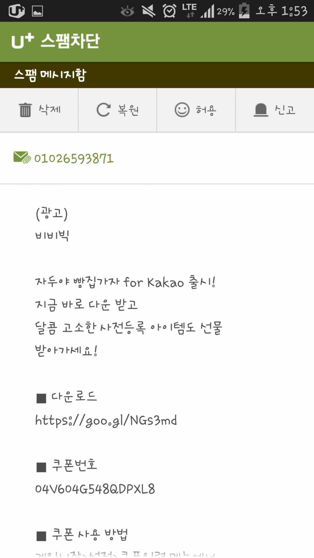 유플러스스팸이라구플레이스토어서다운받으면안에잇어요~^^쿠폰은제가이미사용햇던거입니다~^^