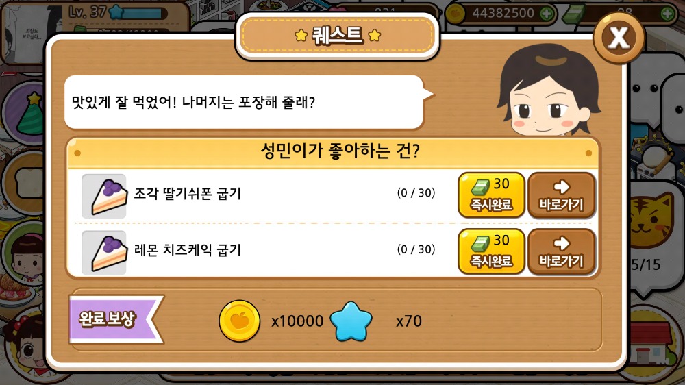 이 퀘스트 레몬치즈케익 몇 개만 더 만들면 끝이었는데 업데이트하고 다시 리셋 됐어요 ㅠㅠ 정말 오래걸렸는데 이거 보고 기절할뻔...사업 자금 퀘스트도 다 깬건데 뜨고요 ㅠㅠ 깬 사람은 안 뜬다 들었는데 으허.. ㅠㅠ